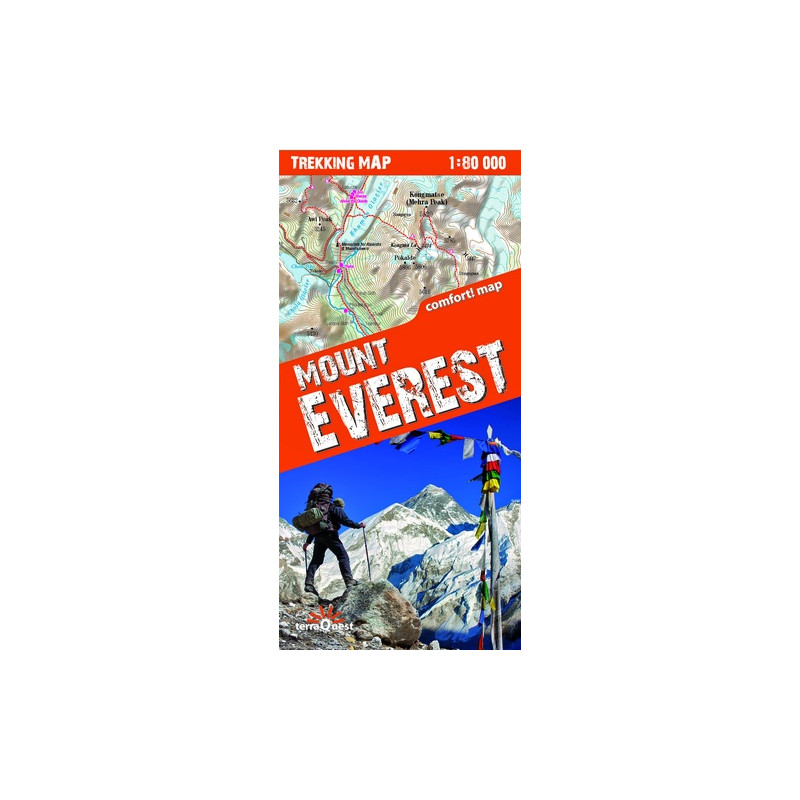 Mapa plastificado, impermeable y resistente del Everest, de la editorial Terra Quest a escala 1:80.000. Incluye información turística básica y práctica para el visitante
